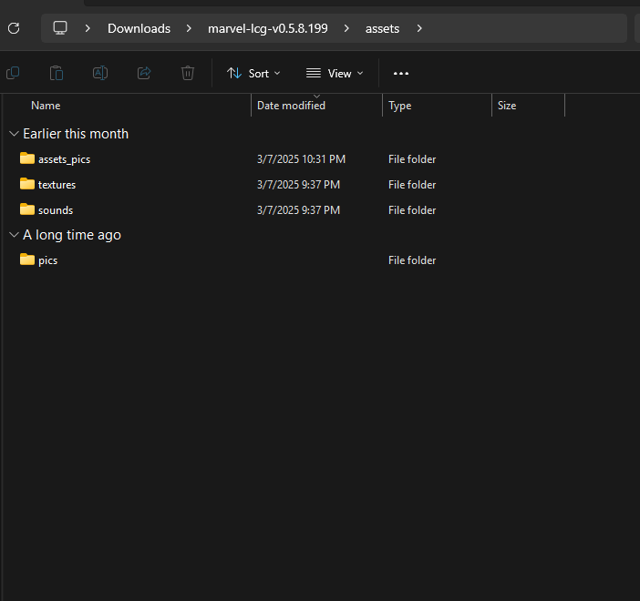 assets_picsfolder is in the right location:D:\\Downloads\\marvel-lcg-v0.5.8.199\\assets. Please ensure that you have the following folder structure:D:\\Downloads\\marvel-lcg-v0.5.8.199\\assets\\assets_pics\\assets\\picsD:\\Downloads\\marvel-lcg-v0.5.8.199\\assets\\assets_pics\\assets\\texturesIf that structure is correct, the next step is to update the
